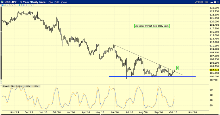 Unfortunately, this daily bars chart shows a potential upside breakout for the dollar against the yen. Given the massive decline in the dollar over the past year against both the yen and gold, a rally is to be expected at some point.