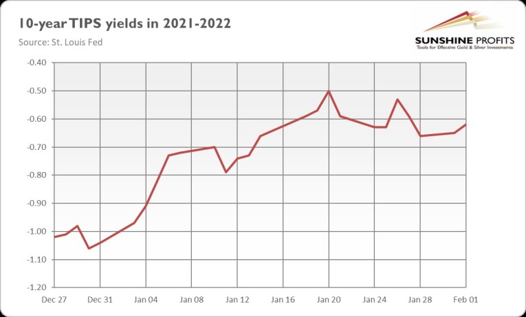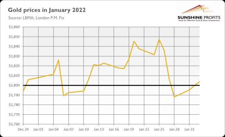 That was quick! January has already ended. Welcome to February! I hope that this year has started well for you. For gold, the first month of 2022 wasn’t particularly good. As the chart below shows, the yellow metal lost about $11 of its value, or less than 1%, during January.