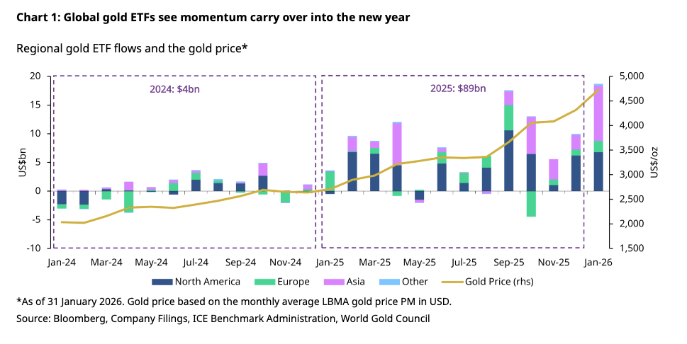 According to the World Gold Council, “Inflows benefited from both the price rally and rising geopolitical tensions involving the U.S. and regions such as Iran, Greenland, and parts of Europe, which helped sustain investor interest in gold.