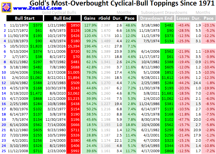 Out of all 13,892 trading days since January 1971, that ranked as gold’s 136th-most-overbought close or top 0.98%. But all the more-overbought days were clustered in only four previous episodes, prior mighty-cyclical-bull toppings. This table sorts all gold’s biggest cyclical bulls since 1971 by their rGold multiples the days gold crested. Today’s gold bull is listed at 1.432x, last Thursday’s level as gold edged up 0.1% to peak.