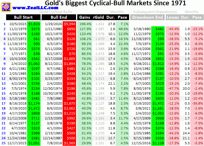 Unbelievably in the 27.8 months between early October 2023 to late January 2026, this latest gold bull powered a jaw-dropping 196.4% higher! Gold nearly tripled in that span without a single 10%+ correction, which is wildly-unprecedented. That makes gold’s epic monster cyclical bull that just topped the biggest-ever by far in US-dollar terms! As this table of gold’s top-25 bulls since 1971 shows, nothing else is even close.