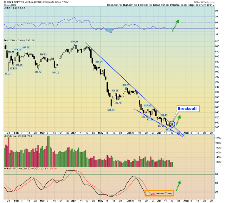 What about the miners? The key CDNX chart. A significant bull wedge breakout may now be in play.