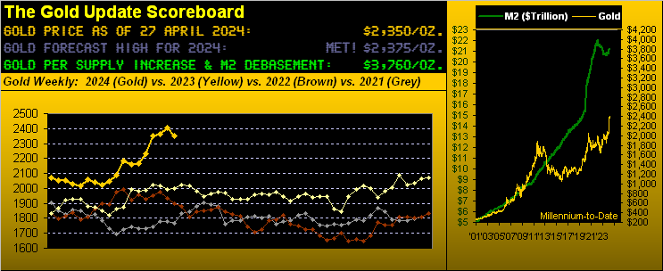 Oh to be sure, Gold through just the first third of this year has already achieved our forecast high of 2375, indeed reaching up to 2449, albeit price settled yesterday (Friday) below both of those levels at 2350. And whilst we’re on record to not upwardly re-forecast a revised target, we’d be surprised should Gold not trade higher still as the year unfolds, even if the Federal Reserve raises rates. ‘Course, you regular readers know we’ve be musing since the start of this year over the Fed actually needing to again raise rates, contra to the non-math parroting crowd’s having called for as many as three rate cuts during 2024, (such expectations having lately been reduced to just one cut toward the end of the year).