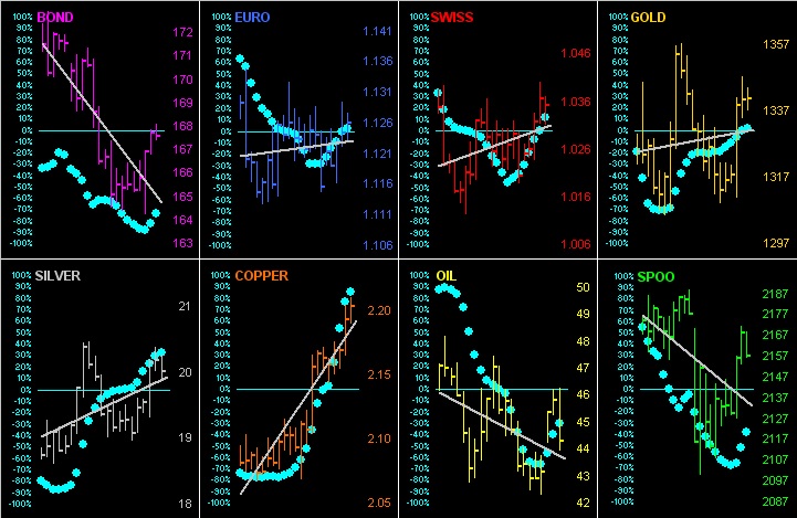 As for the full compliment of the BEGOS Markets (Bond, Euro/Swiss, Gold/Silver/Copper, Oil, S&P), when we last presented their 21-day linear regression trends, all eight were running negative. Now per the following graphic, five are pointing positive, namely those diagonal lines for the metals' triumvirate and the two EuroCurrencies. The baby blue dots are indicative of each trend's consistency, those for Gold (upper right panel) having just crossed to the positive side of their 0% axis. And as go the "Baby Blues"... well, see for yourself. For as goes the iconic blues piece from back in '69 by John Mayall, we've got "Room To Move"higher. Here are the respective markets' last 21 trading days (one month):
