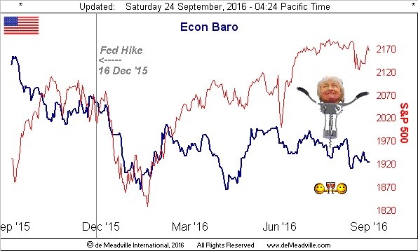 Regardless across the spectrum of opinion, ours analytically regards the track of the Economic Barometer (blue line) in recent months as corkscrewing along with a downside bias, per this view from one year-ago-to-date along with the bubblin' S&P 500 (red line):