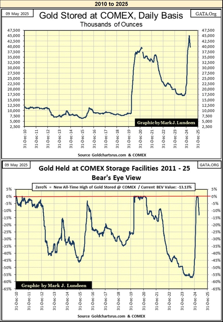 Then, once again gold inventories at the COMEX began spiking upward, from 17.5 million ounces of gold in October 2024, to over 45 million ounces of gold in early April 2025, as the price of gold continued rising in a bull market, but not by that much.