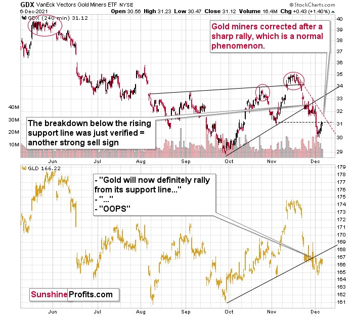 But will it really move higher? I wouldn’t bet the farm on that scenario. Why? Because, for instance, the breakdown in the GLD ETF has been more than verified, and it seems that the flagship ETF for gold is now ready to slide lower - and if it does, miners are likely to slide as well.