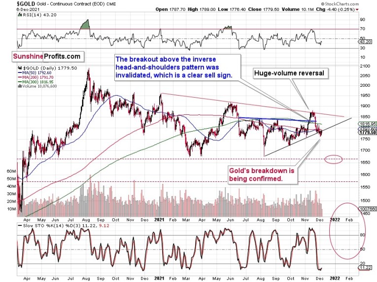 Gold broke below this support line on Thursday (Dec. 2), moved back to it on Friday (Dec. 3) without breaking back above it, and declined once again yesterday (Dec. 6). The decline was not huge (just $4.40), but it was enough as what counts is that it was the third consecutive trading day during which gold didn’t invalidate the breakdown. This makes it a confirmed breakdown, with very bearish implications going forward.