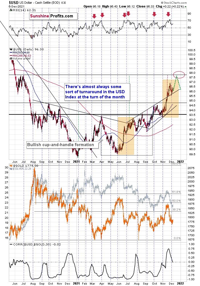 The short-term upswing could trigger gold’s decline to the previous lows, while the following corrective pullback in the USDX could trigger gold’s corrective upswing (from its 2021 lows). This would be in perfect tune with what happened in 2013 right before the huge slide in the precious metals and mining stocks.
