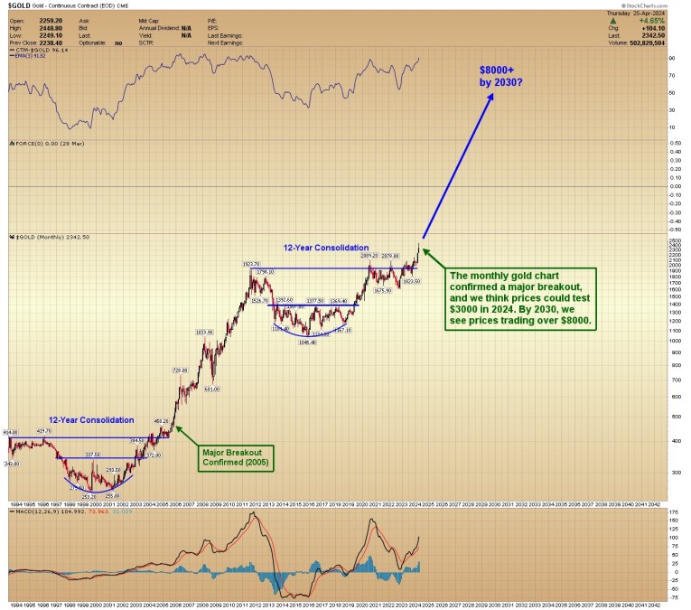 GOLD MONTHLY- The monthly gold chart confirmed a major breakout, and we think prices could test $3000 in 2024. By 2030, we see prices trading over $8000.