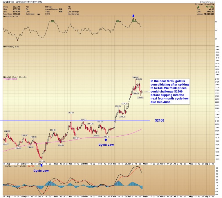 GOLD- In the near term, gold is consolidating after spiking to $2448. We think prices could challenge $2500 before slipping into the next four-month cycle low due mid-June.