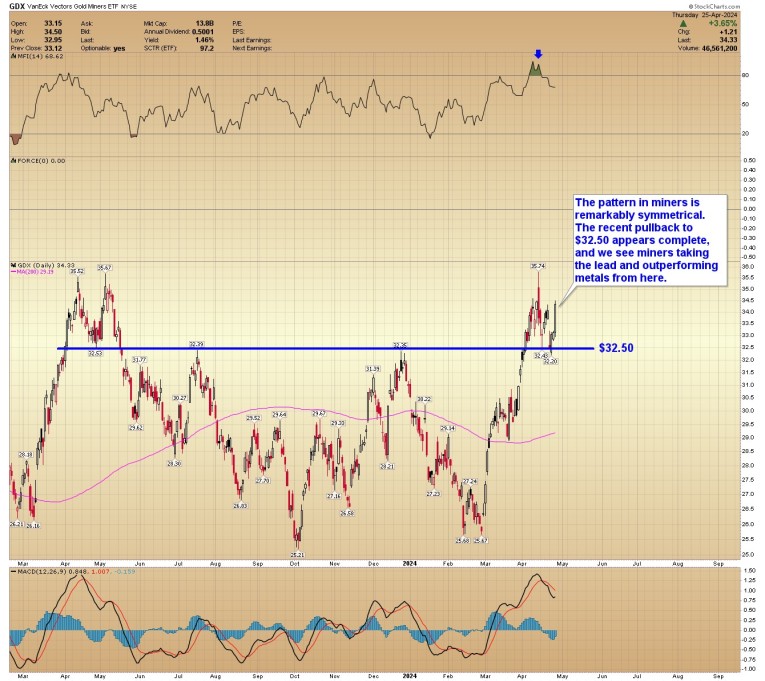 GDX- The pattern in miners is remarkably symmetrical. The recent pullback to $32.50 appears complete, and we see miners taking the lead and outperforming metals from here.