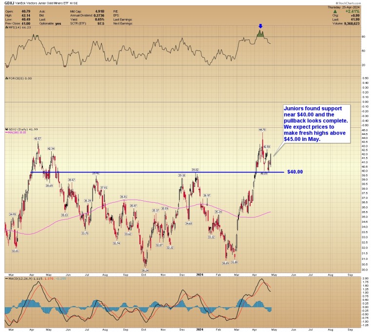 GDXJ- Juniors found support near $40.00 and the pullback looks complete. We expect prices to make fresh highs above $45.00 in May.