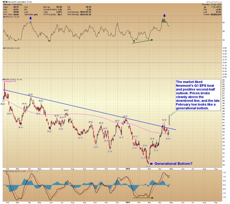 NEM- The market liked Newmont's Q1 EPS beat and positive second-half outlook. Prices broke cleanly above the downtrend line, and the late February low looks like a generational bottom.