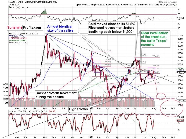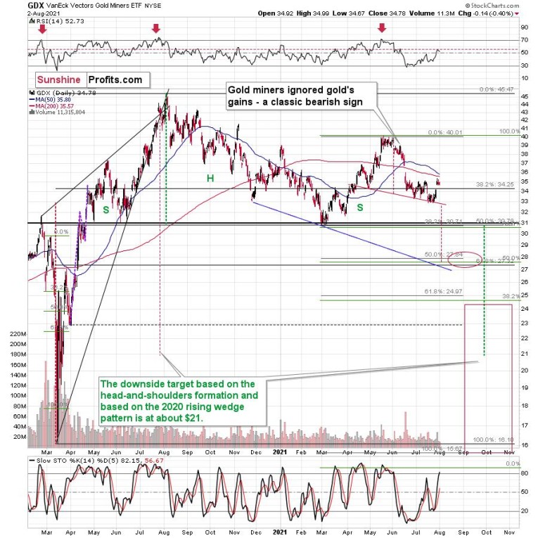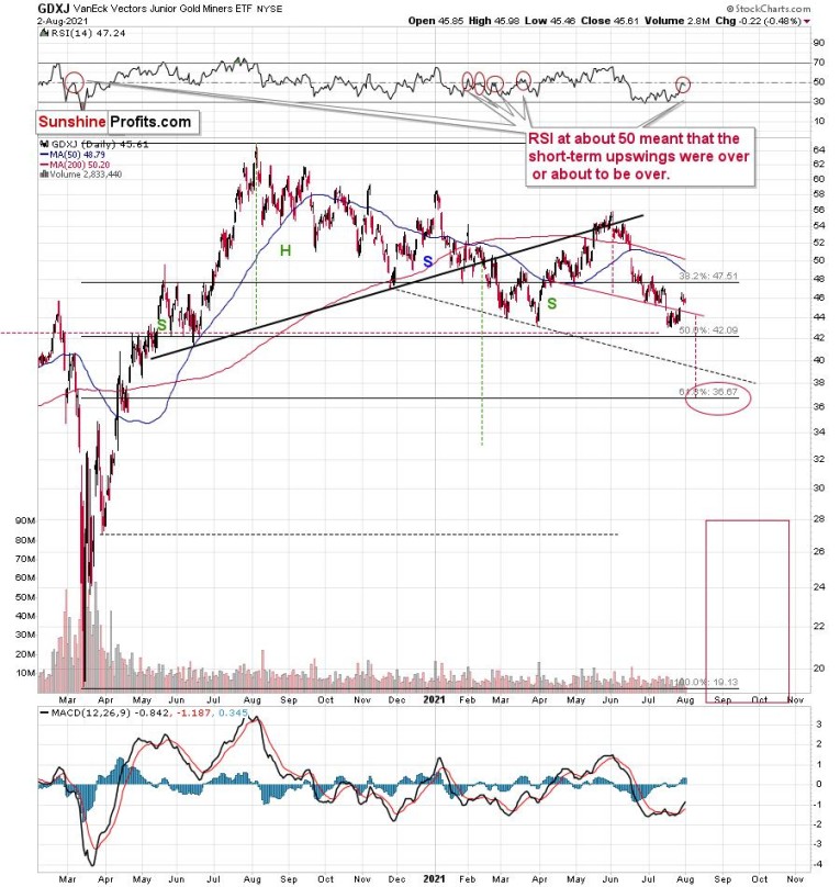 Gold is demonstrating its early-2021 deception – back then, the yellow metal moved slightly above its previous highs following its initial collapse. And with the yellow metal correcting roughly 50% of its decline once again this time around (marked with purple rectangles), the price action is completely normal within the context of a medium-term downswing. Thus, while cooler heads have prevailed in July – following the yellow metal’s steep drawdown in June – a decline to the March lows (roughly $1,670) is likely the next stop along the bearish journey.