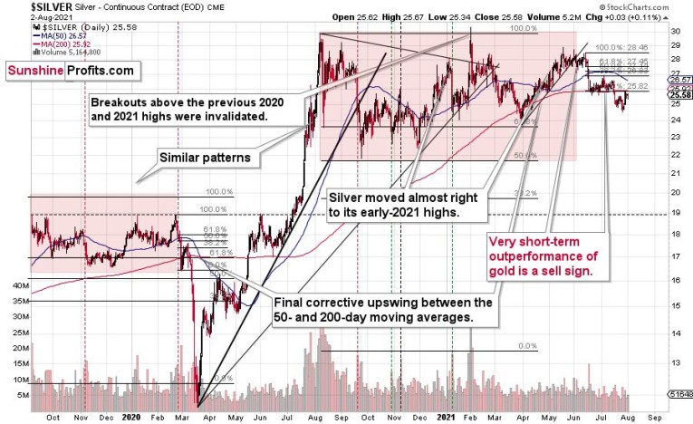 What’s more, let’s take a look at the recent move higher in the value of the linear correlation coefficient between gold and the USD Index (bottom part of the chart). There were a few similar periods when it rallied and gold moved higher as well. I marked those cases with vertical dashed lines. In all three cases, it was right before gold turned south and declined in a quite profound manner. In one case (Sep. 2020), gold moved back and forth for several days before declining, but it then declined significantly anyway. The implications for gold and the rest of the precious metals sector are bearish.