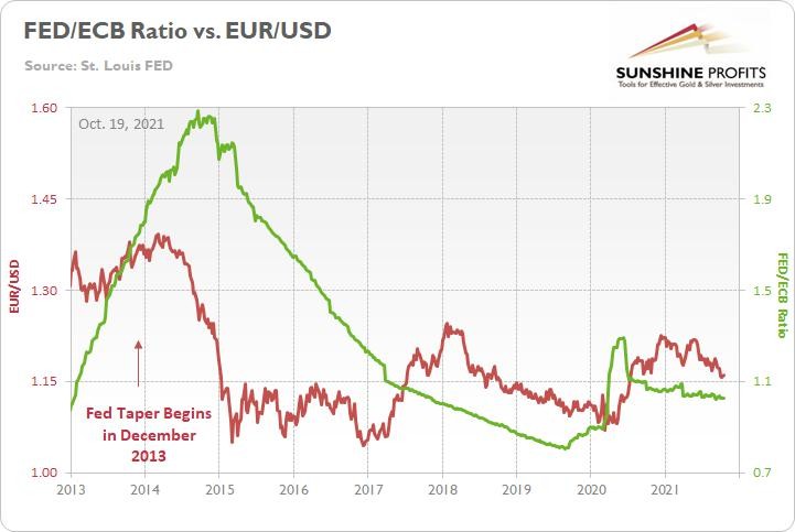 To explain, the red line above tracks the EUR/USD, while the green line above tracks the Fed/ECB ratio. If you focus your attention on the left side of the chart, the red arrow depicts when the Fed began reducing its bond-buying program in 2013. Moreover, if you analyze the performance of both variables, you can see that the EUR/USD fell off a cliff soon after and the Fed/ECB ratio plunged after a roughly 12-month delay.