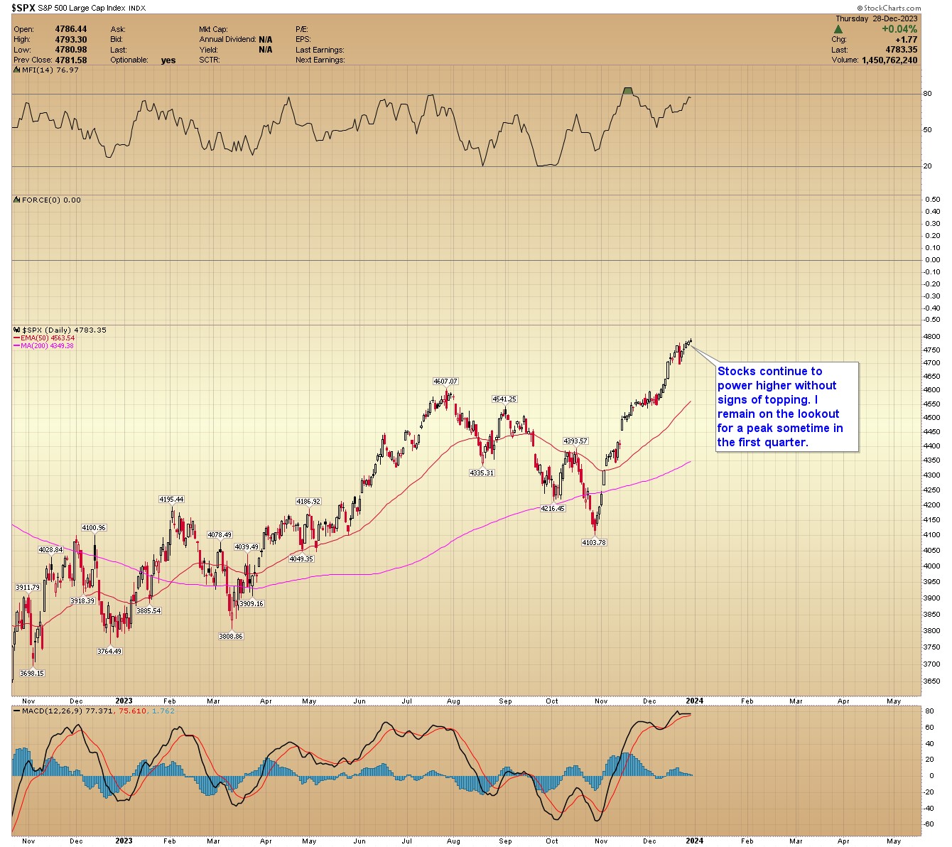 Gold is very close to a historic breakout, and sub-$2000 prices may become a distant memory. Silver is lagging but always catches up. Gold miners may pull back into January but could become the best-performing asset in 2024.