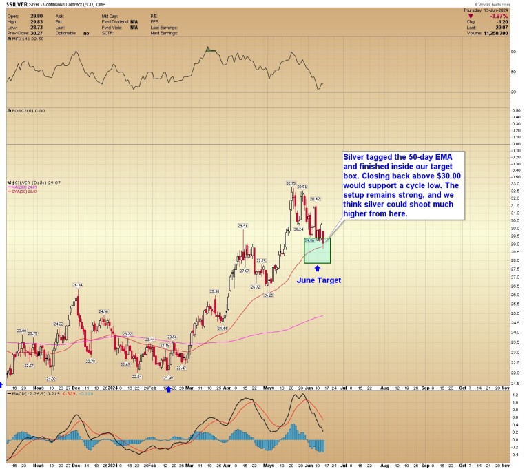 SILVER- Silver tagged the 50-day EMA and finished inside our target box. Closing back above $30.00 would support a cycle low. The setup remains strong, and we think silver could shoot much higher from here.
