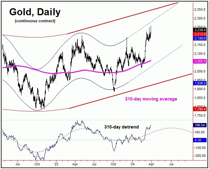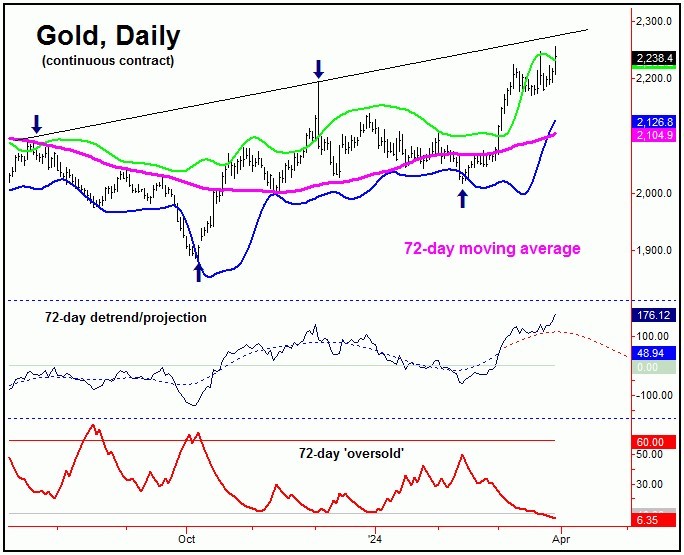 In terms of time, the average rally phases with this 72-day cycle were noted as having taken 39 trading days before topping, which suggested the potential for higher highs into early-April or later. I mentioned then, the potential for a push up to the 2230-2260 region (for the April contract) - which the recent action has now satisfied.