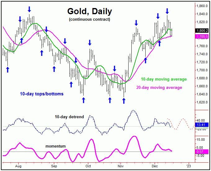 For the near-term picture, the downward phase of the 10 and 20-day cycles has been in force off the 1838.80 swing top, with price seeing a drop back to the 10 and 20-day moving averages - a normal expectation with these cycles. Shown below is the smaller of these two waves, the 10-day component: