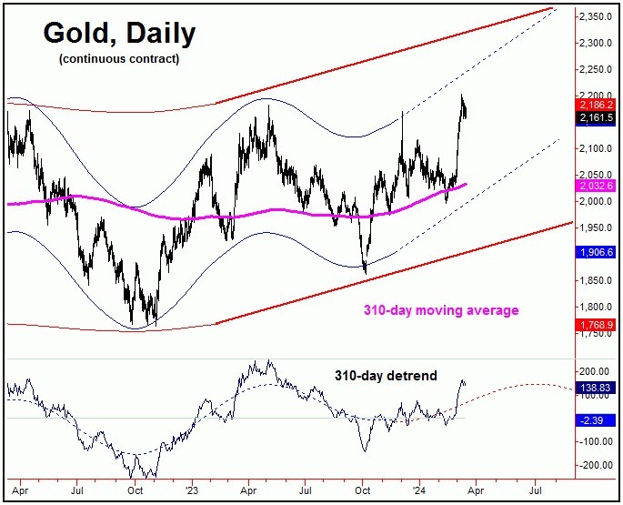 This 72-day cycle component was projected to bottom into the late-January to mid- February region - as per the path suggested by our 72-day detrend indicator. Its actual bottom came in with the February 14th tag of 1996.40 (April, 2024 contract). This action was confirmed by taking out a key upside price reversal figure for Gold.