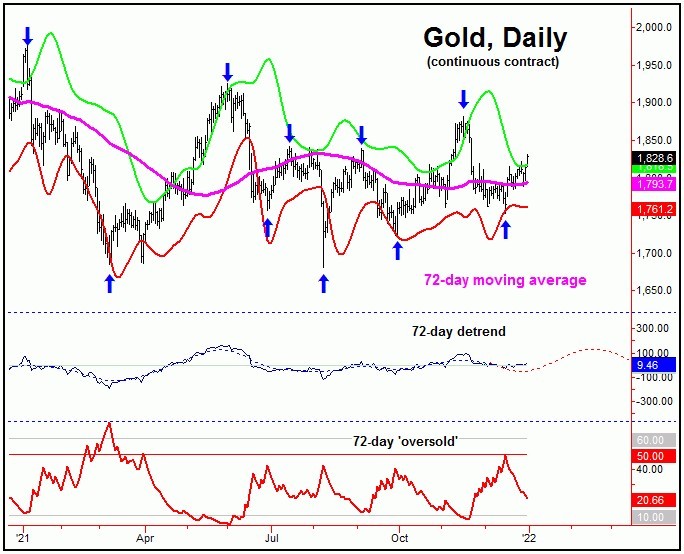 From my 12/12/21 article: "In terms of price with the above, the ideal path is looking for the current 72-day cycle downward phase is looking for a drop back to the lower 72-day cycle band, which is currently at the 1741 figure - but which is also moving daily. Going further, a drop back to the lower 72-day cycle band - and/or accompanied by a spike above our upper 72-day 'oversold' reference line - would be seen as a buying opportunity, in the anticipation of a sharp rally playing out into the first few months of next year."
