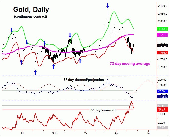 Of note is that our 72-day 'oversold' indicator recently spiked above its upper reference line - along with the metal seeing a daily close below the lower 72-day cycle band. From the comments made in recent articles, this pattern/setup is something often seen near key lows for this 72-day component.