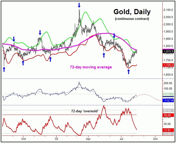 Stepping back slightly, a countertrend dip with the 10 and 20-day cycles in the days ahead - if seen as noted - would be favored to give way to higher highs on the next swing up with these waves. In terms of time, that action would likely put us into the late-August to very early-September timeframe, then to be on the lookout for the next peak with the larger 72-day cycle, shown below: