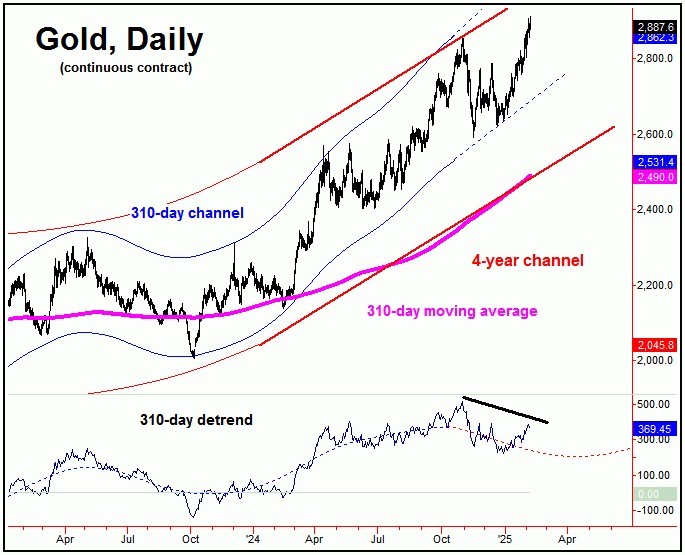 Once this 72-day wave tops out, its next bottom (as projected by our 72-day detrend indicator) is due around the early-April window, plus or minus. In terms of price, our downside 'reversal point' for this 72-day cycle is currently set at the 2795.80 figure (April, 2025 contract).