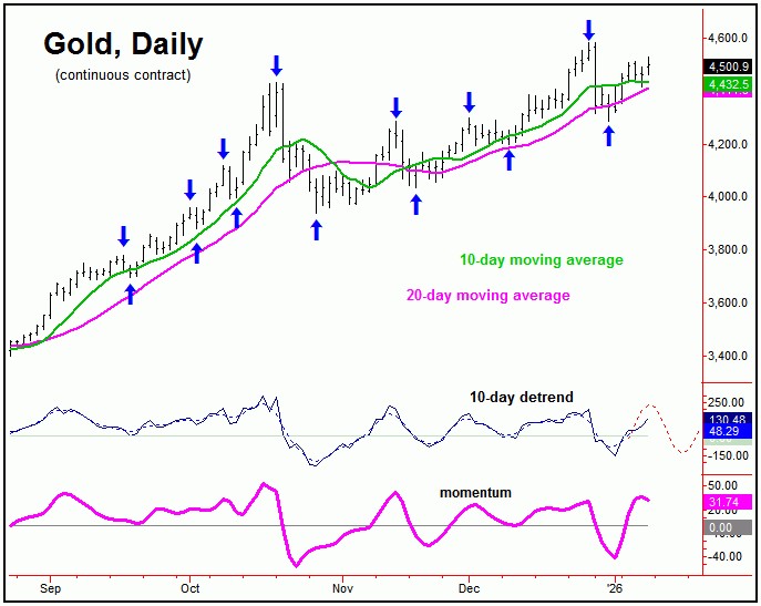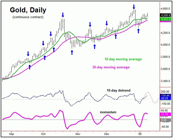 As mentioned above, the last upward phase of our 10-day wave was very extended into late-December, and was due for a sharp correction. Just following that article, our downside 'reversal point' for this wave had moved up to the 4469.90 figure (February, 2026 contract), and was noted our Gold Wave Trader report. This number was taken out to the downside on 12/29/25 - thus triggering the last short-term decline.