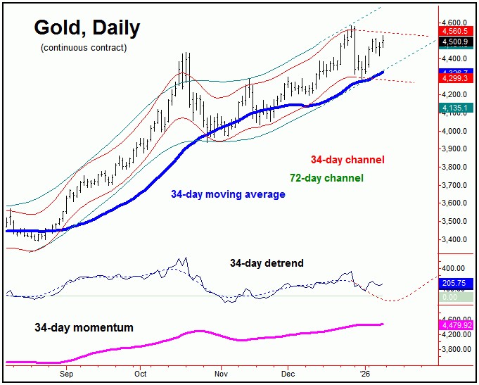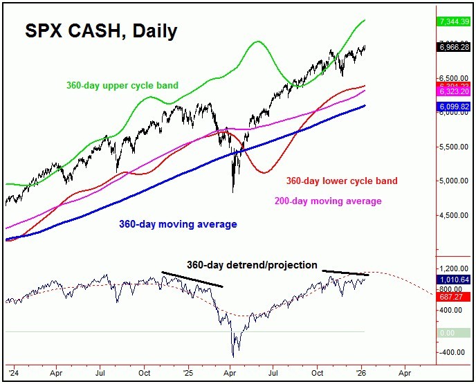 From my 12/20/25 article: "the upward phase of this 34-day cycle has been in force in past weeks, and is also into extended range for a peak. The next decent correction should come from this particular cycle, and does have the potential to peak with the current upward phase of the smaller 10-day component. The next correction phase of this 34-day cycle should see a minimum drop back to the 34-day moving average."