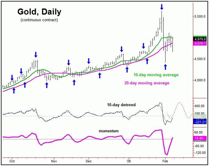On February 3rd, the upward phase of our 10-day cycle was labeled back in force, targeting a rally to the 5100-5300 level, the lower-end of which was met with the action that followed. Having said that, simply due to normal time statistics with this wave, there is decent potential for the recent weakness (4670) into early-Friday to give way to another try at strength with this cycle.