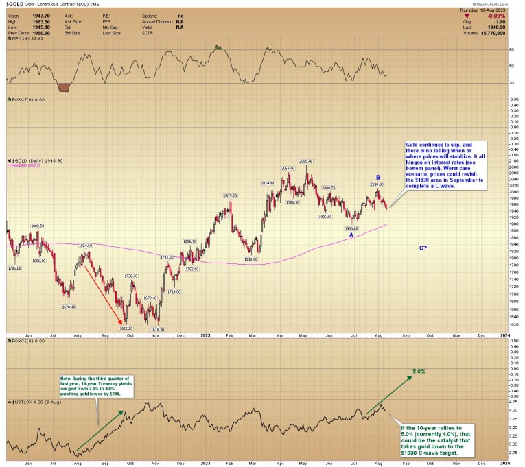 Note: During the third quarter of last year, 10-year Treasury yields surged from 2.6% to 4.0% pushing gold lower by $200. If the 10-year rallies to 5.0% (currently 4.0%), that could be the catalyst that takes gold down to the $1830 C-wave target.