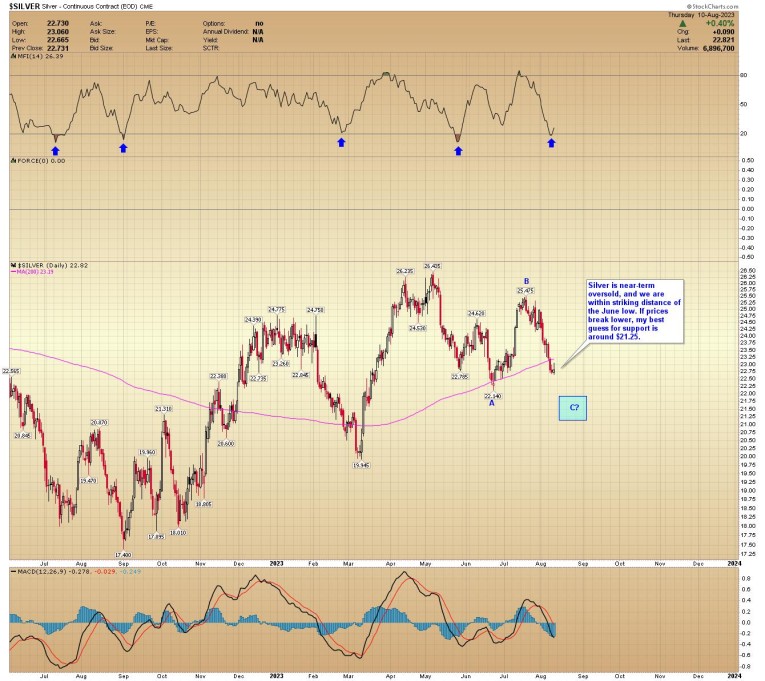 SILVER- Silver is near-term oversold, and we are within striking distance of the June low. If prices break lower, my best guess for support is around $21.25.