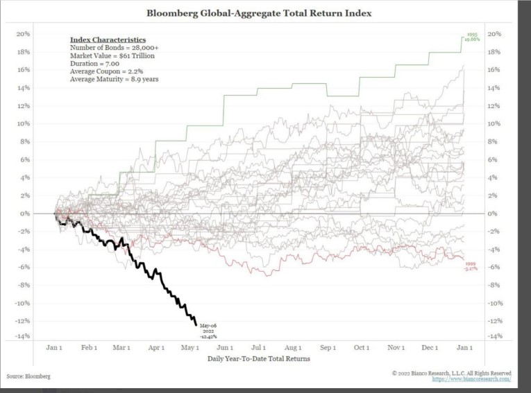 Below is a chart for the Bloomberg aggregate bond index going back several decades. At -12.42%, this is the worst year-to-date return ever; nothing comes close.