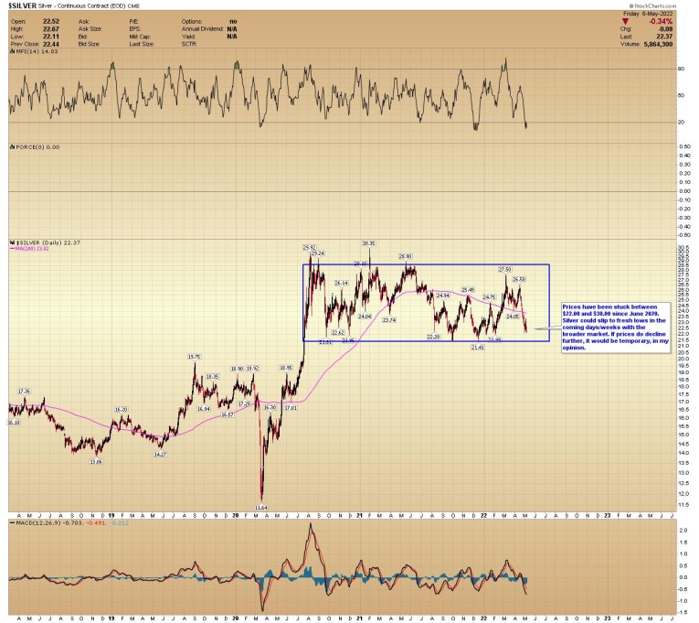 Silver prices have been stuck between $22.00 and $30.00 since June 2020. Silver could slip to fresh lows in the coming days/weeks with the broader market. If prices do decline further, it would be temporary, in my opinion.