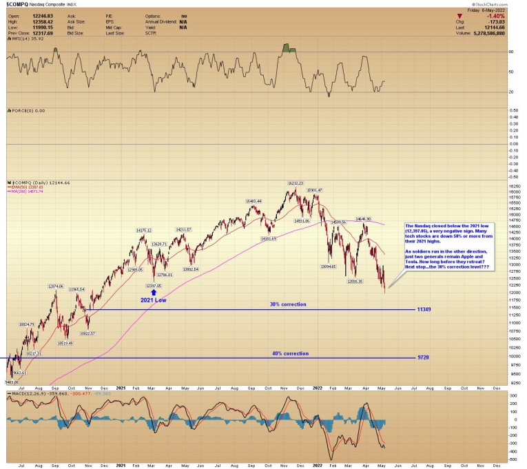 The Nasdaq closed below the 2021 low (12,397.05), a very negative sign. Many tech stocks are down 50% or more from their 2021 highs.