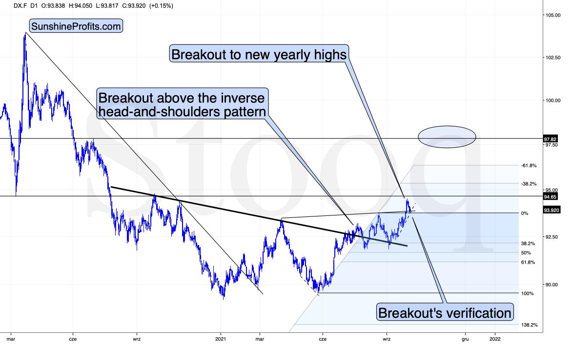 I previously mentioned that the USD Index is likely to consolidate either below or above its horizontal resistance at about 94.5, and what we’re seeing right now is a consolidation below this level. Once this level is taken out, the USDX could actually rally further without a bigger post-breakout consolidation. Consequently, I’m removing the short-term target area around this level as it no longer seems likely that the USDX will form a meaningful top there.