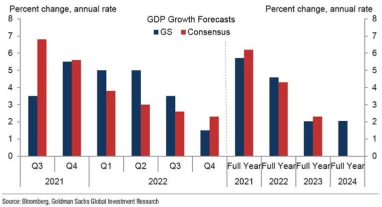 To explain, the blue bars above track Goldman Sachs’ GDP growth estimates, while the red bars above track economists’ consensus estimates. If you analyze the columns labeled “Q4” and “Full Year 2022,” you can see that Goldman Sachs expects a sharper-than-expected slowdown in the autumn months, and the weakness should persist into 2022.