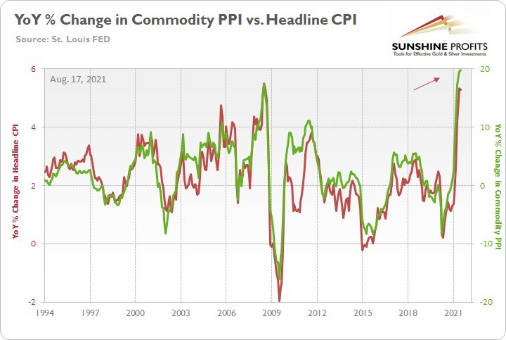 To explain, the green line above tracks the year-over-year (YoY) percentage change in the commodity PPI, while the red line above tracks the YoY percentage change in the headline CPI. If you analyze the relationship, you can see that the pair have a close connection.