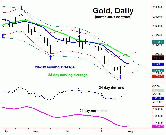 If the move is going to end up as an immediate failure, then it would do so at or near this same 34-day average - which is also near the upper (and declining) 72-day cycle channel. From there, a drop back to or below the lows would be possible into the mid-to-late August timeframe, before bottoming the larger 72-day cycle: