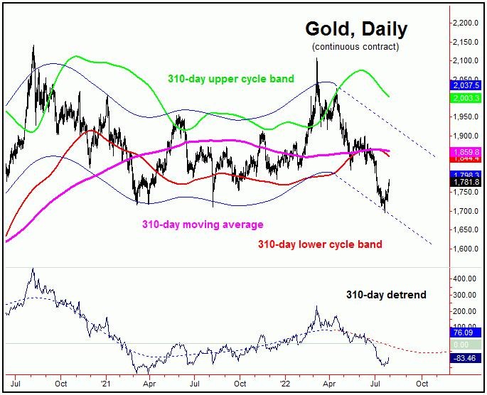 For the mid-term picture, however, the overall assumption is that the rally phase of the 72-day cycle will end up as a countertrend affair, giving way to lower lows into mid-to-late October of this year or later. This again is due to the current position of the larger 310-day cycle, shown again on the chart below: