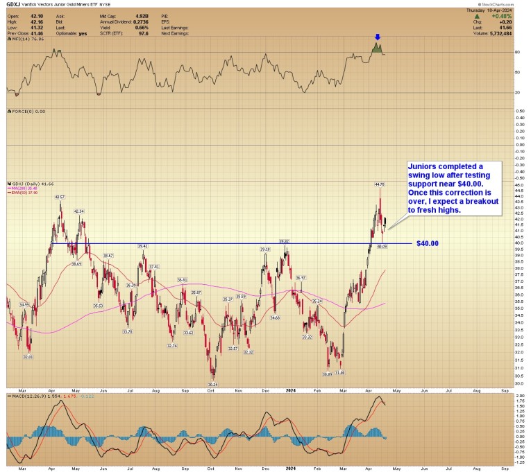 GDXJ- Juniors completed a swing low after testing support near $40.00. Once this correction is over, I expect a breakout to fresh highs.