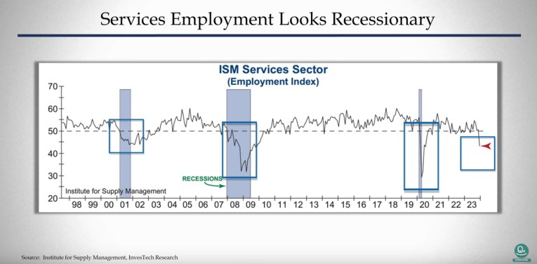 Employment in the service sector remains well below 50, which typically occurs during recessions. See the drawdowns of 2001, 2008, and 2020. Maybe this time is different, but those words can be dangerous.