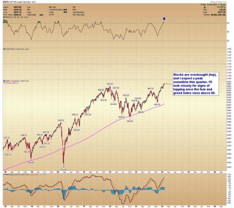 Stocks are overbought (top), and I expect a peak sometime this quarter. I'll look closely for signs of topping once the fear and greed index rises above 80.