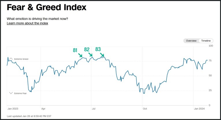 The stock market has soared since October, reaching new all-time highs. I like to monitor the fear and greed index at turning points. Once north of 80, investors are sufficiently complacent, and I begin looking for signs of topping.