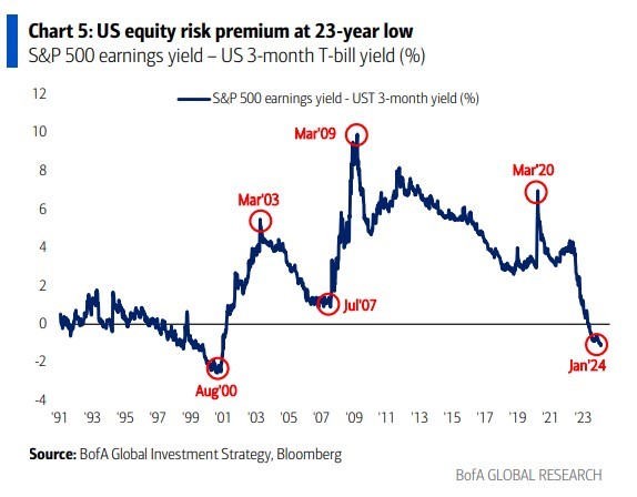 One way to value stocks is by comparing the earnings of the S&P 500 to the U.S. 3-month Treasury bill. The chart below shows that the equity risk premium is negative, suggesting no benefit to buying stocks. The last time it was this low was around the 2000 dot.com collapse.