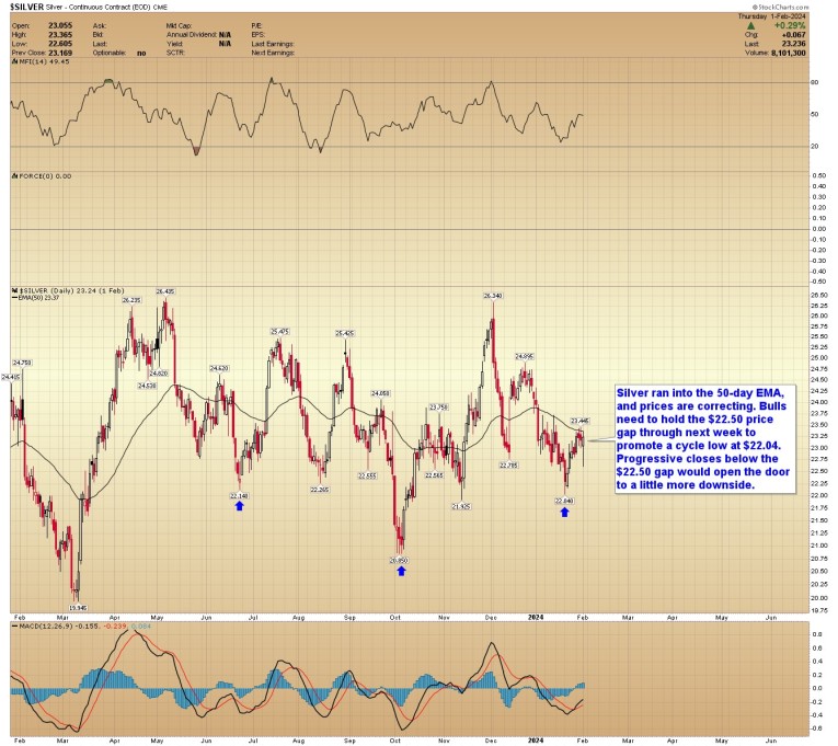 Silver ran into the 50-day EMA, and prices are correcting. Bulls need to hold the $22.50 price gap through next week to promote a cycle low at $22.04. Progressive closes below the $22.50 gap would open the door to a little more downside.