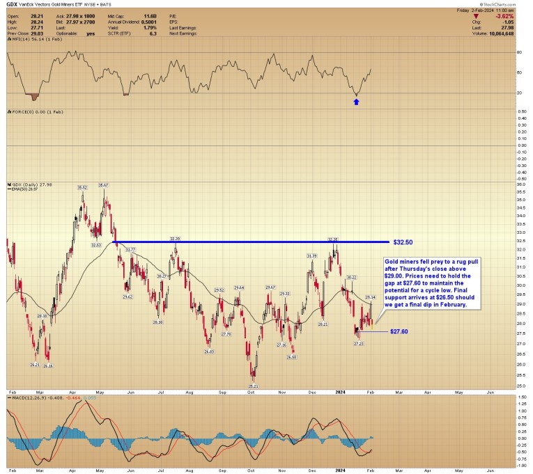 Gold miners fell prey to a rug pull after Thursday's close above $29.00. Prices need to hold the gap at $27.60 to maintain the potential for a cycle low. Final support arrives at $26.50 should we get a final dip in February.